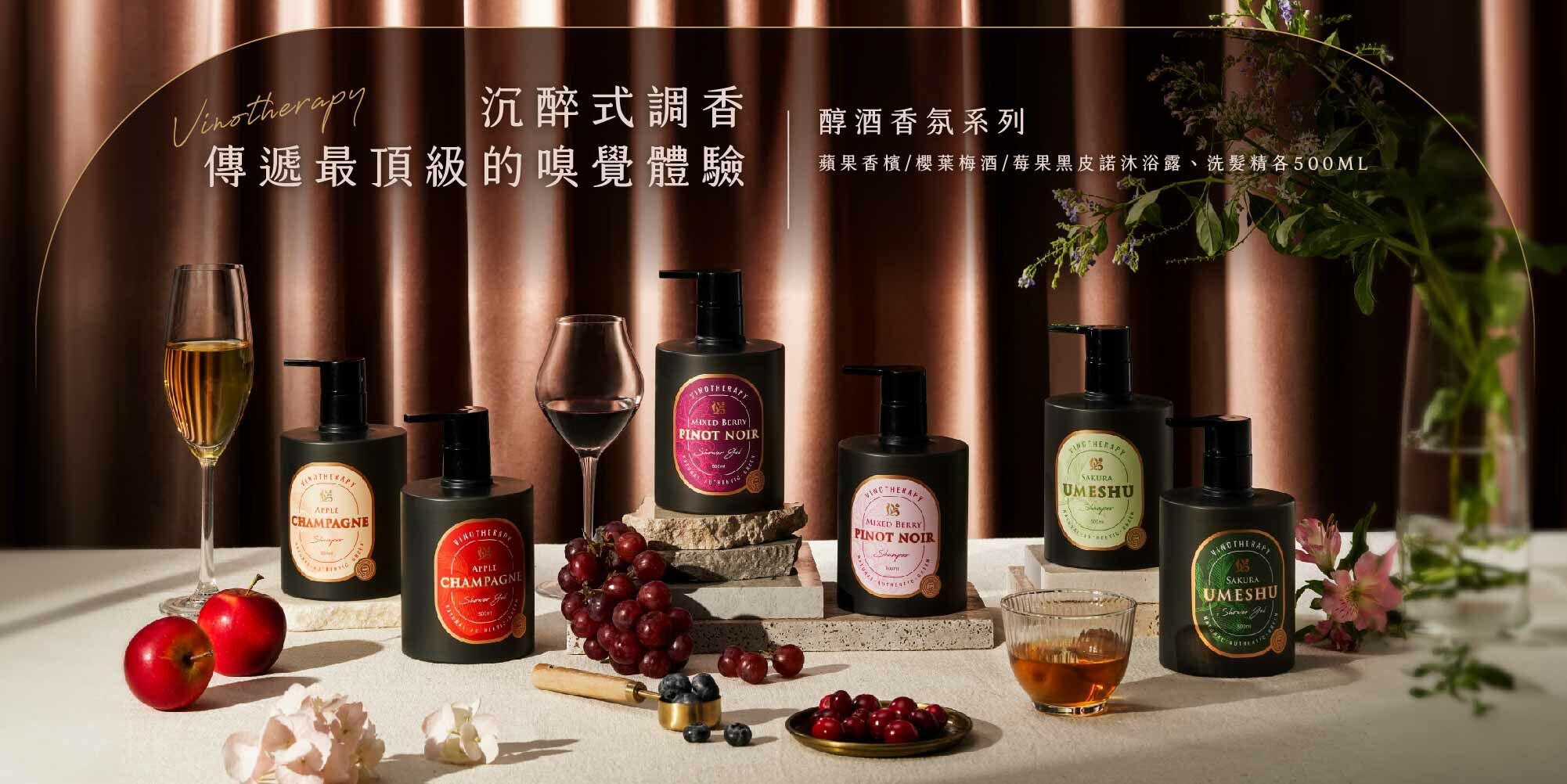 香草集全新推出「醇酒香氛沐浴系列」,包括「莓果黑皮諾」、「蘋果香檳」、「櫻葉梅酒」沐浴洗髮品,以綠色胺基酸界面活性劑打造對肌膚溫和、且符合環境永續的潔淨配方。 並添加釀酒過程中會使用的釀酒葡萄多酚、梅果實取萃取、蘋果萃取等活性成分,含84%以上天然萃取。令人沉醉的香氣則是與國際調香師合作的職人工藝,邀請您一起來體驗最頂級的嗅覺饗宴。