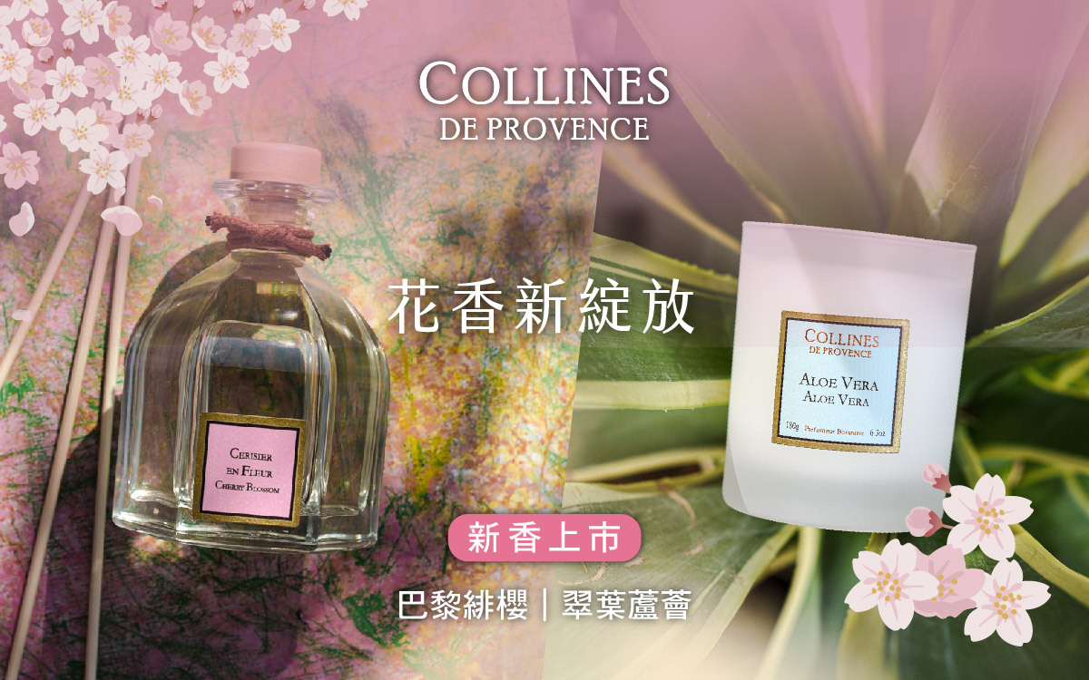 Collines de Provence 新香登場,2023年引入新香作品,浪漫緋櫻帶點野莓,香味層次更顯活潑;蘆薈的清新感,透明的香氣彷彿感受到無憂無慮的氣息。全新兩款「巴黎緋櫻、翠葉蘆薈」立刻讓居家生活格調從嗅覺上大大提升質感享受。居家擴香香氛系列絕對一聞秒收!