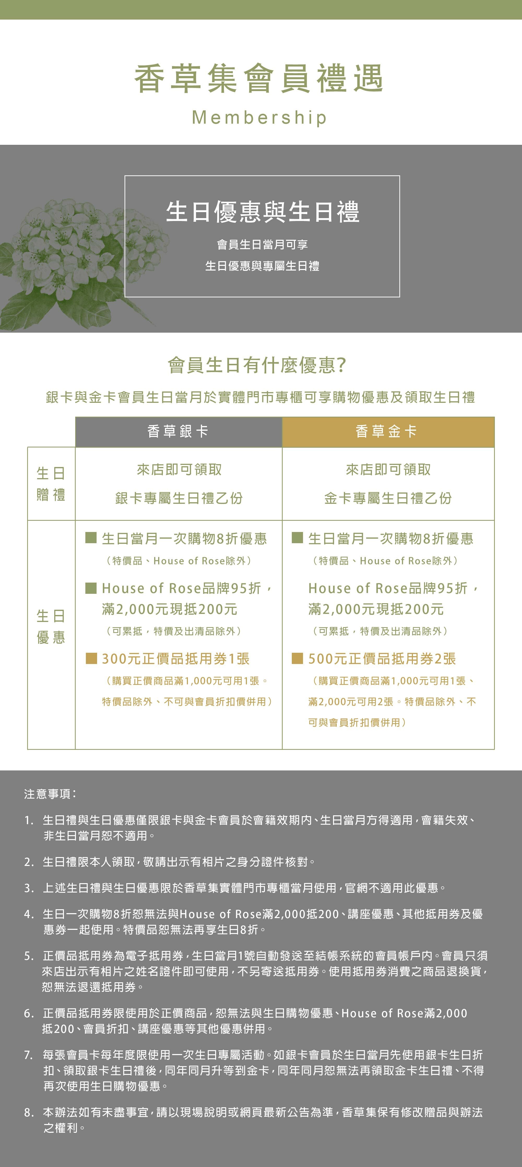 本網頁刊載之各項會員制度辦法於2022年1月3日(一)起實施,詳細辦法若有異動,請以香草集最新公告或店內服務人員說明為準。