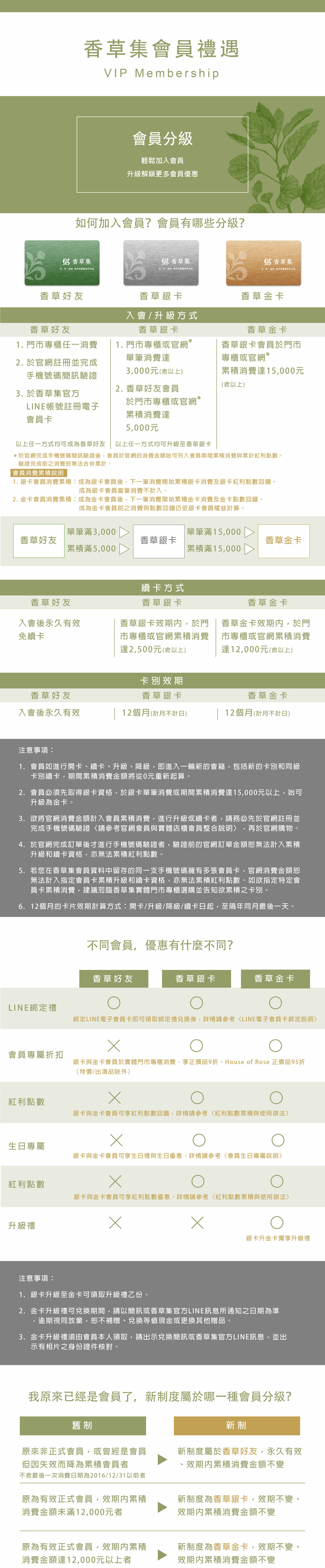 本網頁刊載之各項會員制度辦法於2022年1月3日(一)起實施,詳細辦法若有異動,請以香草集最新公告或店內服務人員說明為準。