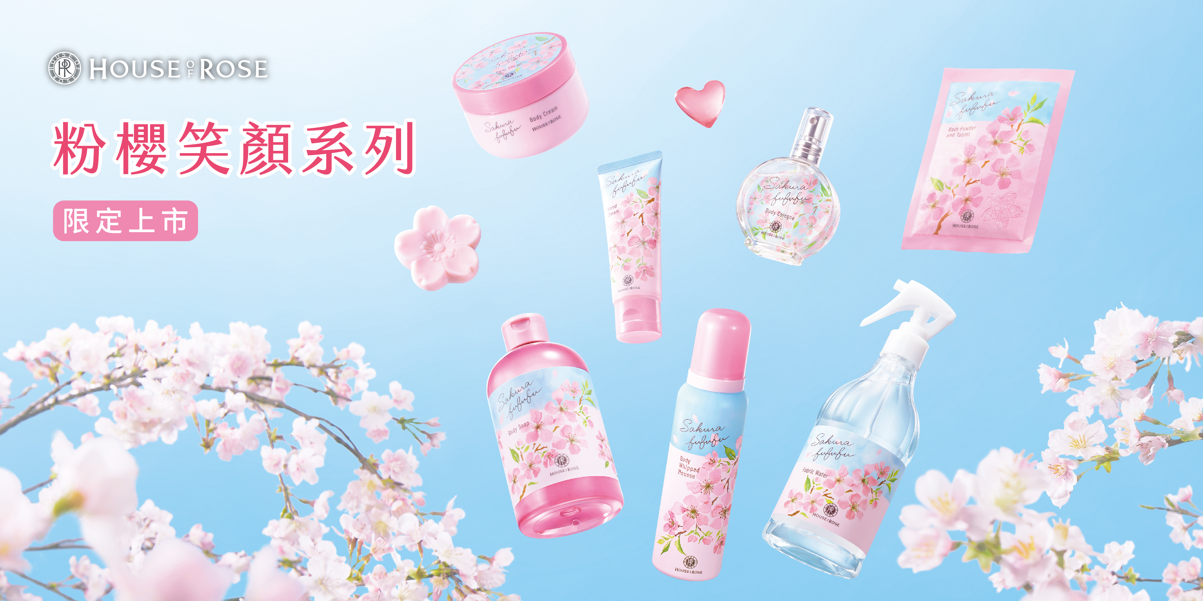 天然保養品牌House of Rose限定的粉櫻笑顏系列,結合了櫻花香甜的氣味和保濕萃取,為粉嫩肌膚帶來充分保濕和亮麗,感受春日舒適清新的溫柔愜意。