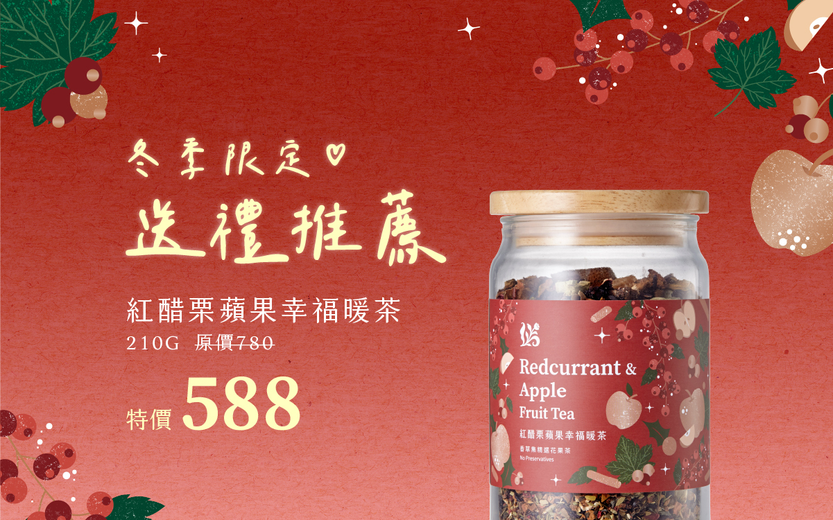 紅醋栗果實纍纍洋溢聖誕和新年的紅色喜悅,蘋果肉桂薑茶送來冷冬中的一絲暖意,粉紅玫瑰與草莓果粒增添了浪漫的幸福感。在微寒時節,送上一壺花果暖茶,暖心暖身,甜蜜入喉,祝願來年的幸運美好。