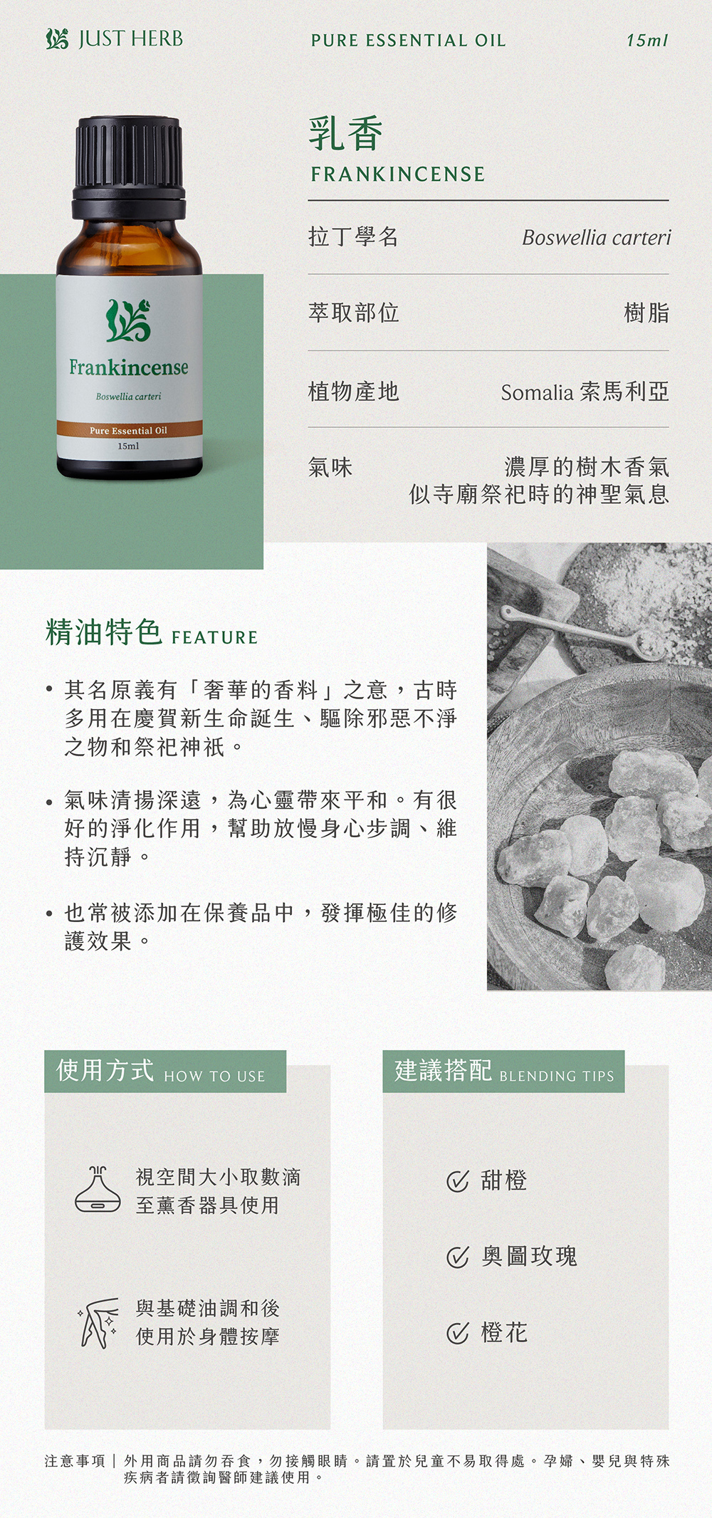 * 氣味清揚深遠,為心靈帶來平和。有很好的淨化作用,幫助放慢身心步調、維持沉靜。